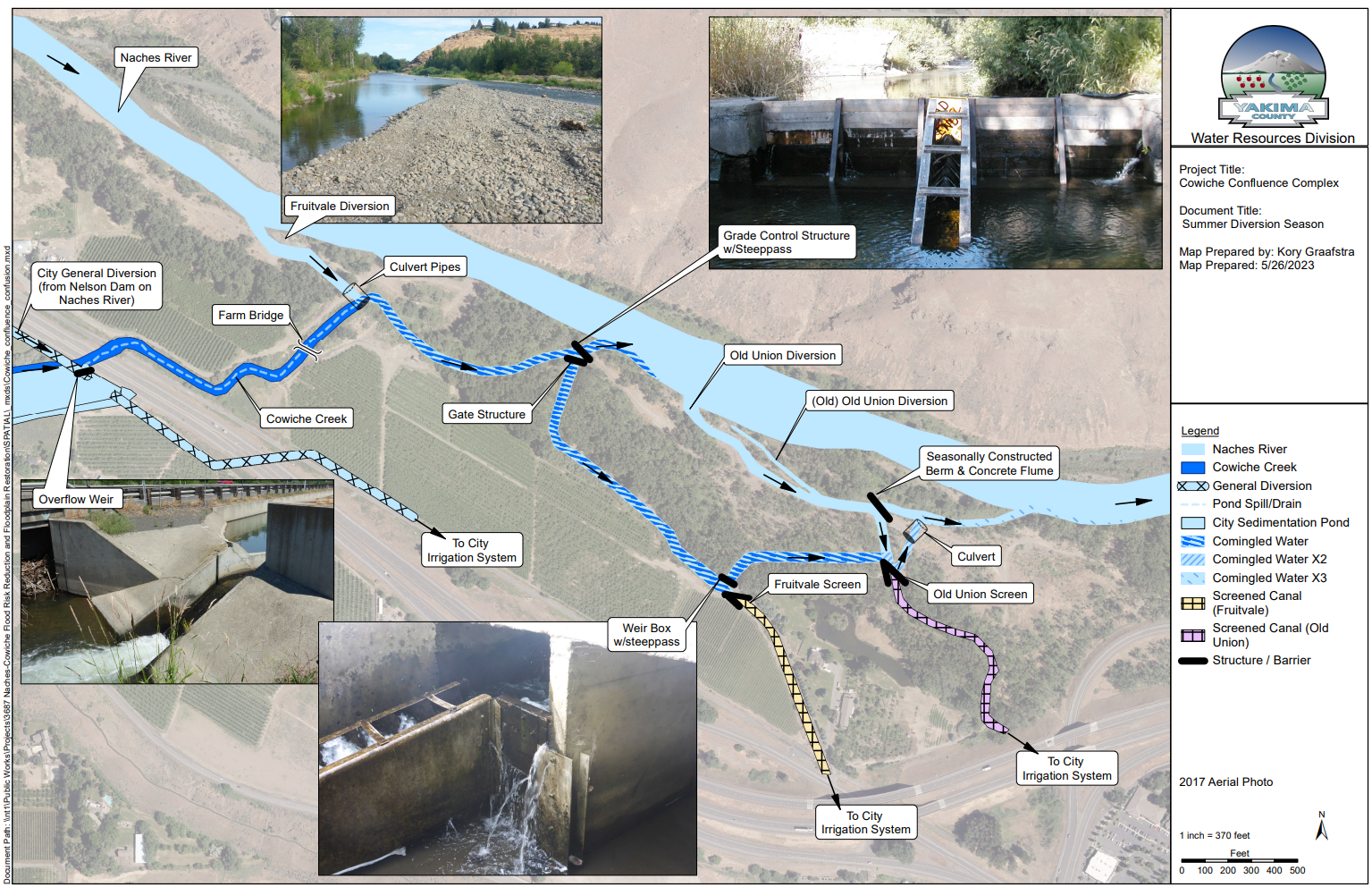 The Naches – Cowiche Flood Risk Reduction and Floodplain Restoration project transforms the confluence of the Naches River and Cowiche Creek by creating active riverine habitat and improving floodplain connectivity, while providing improved fish passage, water use efficiency and improved sustainable and resilient infrastructure, public safety for both flood hazard and transportation, and other public needs such as recreation and open space retention. In the Naches-Cowiche confluence, the lynch pin to achieving the ability to implement measures that meet the above goals at a transformative scale is the retirement and removal of the outdated irrigation canals, bypasses and fish ladders that litter the confluence, and installing new delivery pipes outside of this valuable confluence.