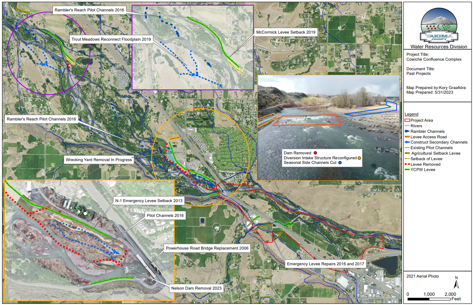 The Naches – Cowiche Flood Risk Reduction and Floodplain Restoration project transforms the confluence of the Naches River and Cowiche Creek by creating active riverine habitat and improving floodplain connectivity, while providing improved fish passage, water use efficiency and improved sustainable and resilient infrastructure, public safety for both flood hazard and transportation, and other public needs such as recreation and open space retention. In the Naches-Cowiche confluence, the lynch pin to achieving the ability to implement measures that meet the above goals at a transformative scale is the retirement and removal of the outdated irrigation canals, bypasses and fish ladders that litter the confluence, and installing new delivery pipes outside of this valuable confluence.